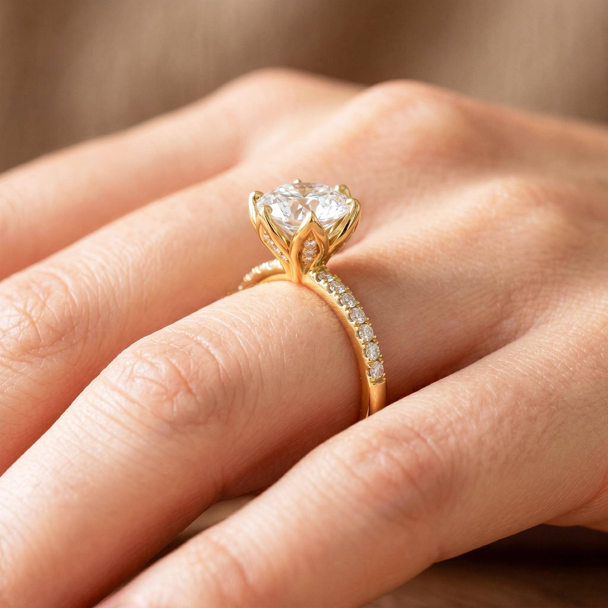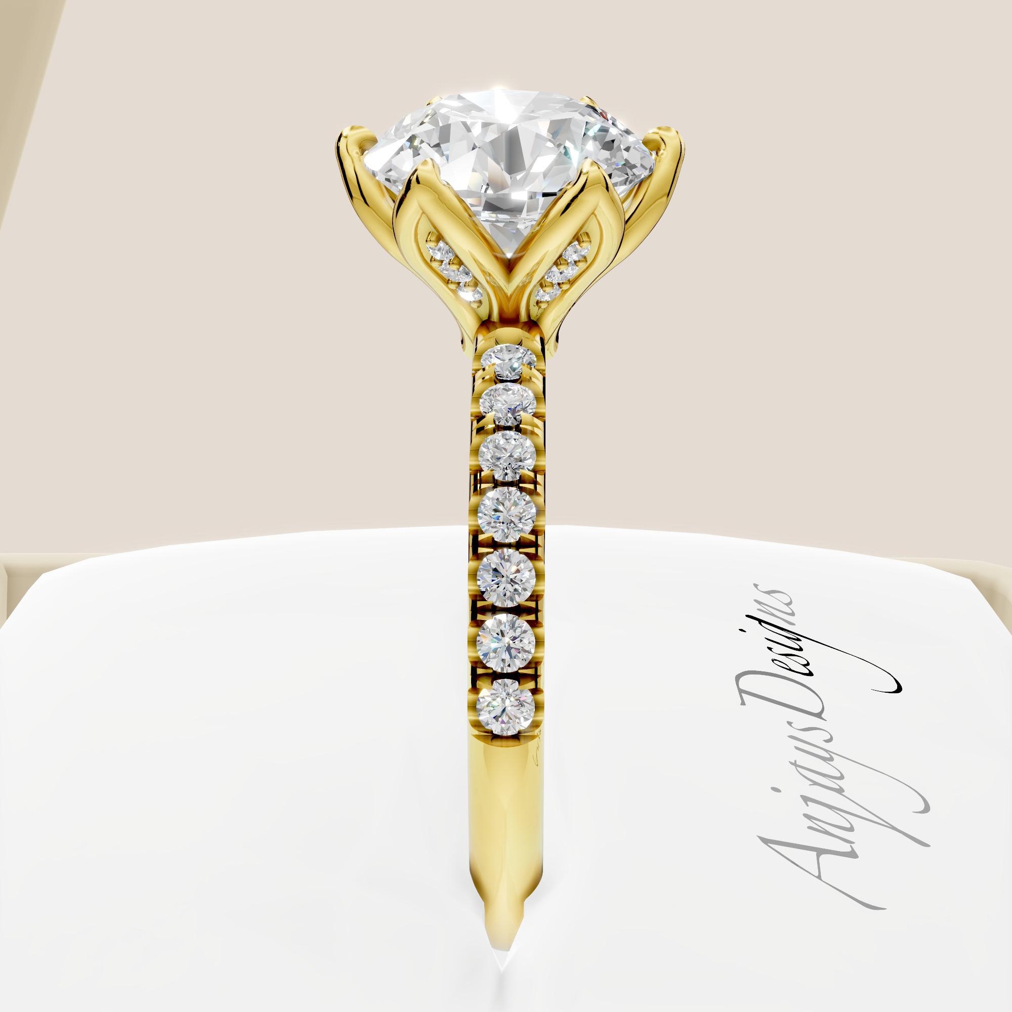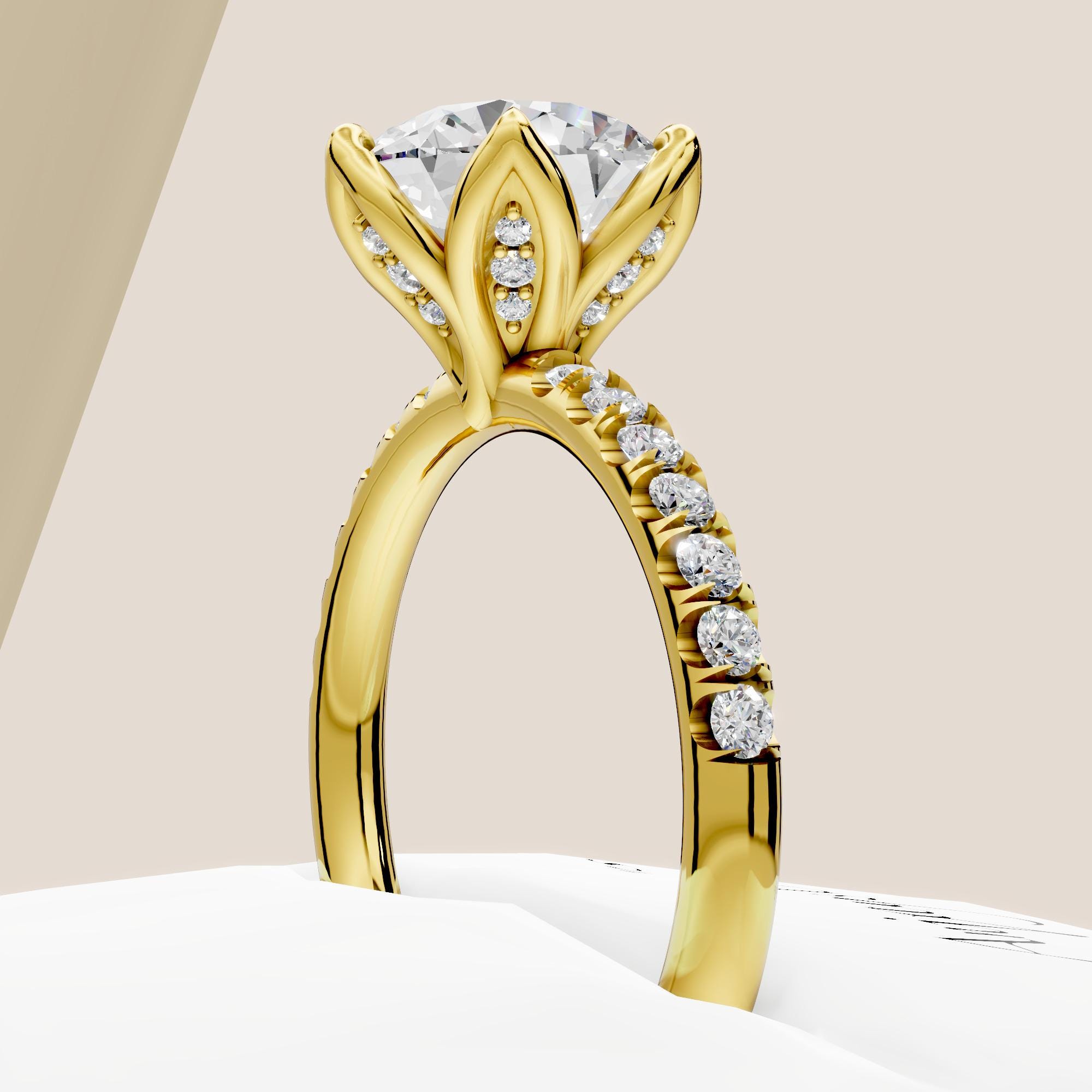 Celebrate love with this nature inspired diamond engagement ring, featuring a glistening 2ct round lab grown diamond set in floral prongs! Made in 14k yellow gold, this unique engagement ring captures the beauty of nature in a timeless style. A perfect choice for those who seek a classic yet unique promise to forever!