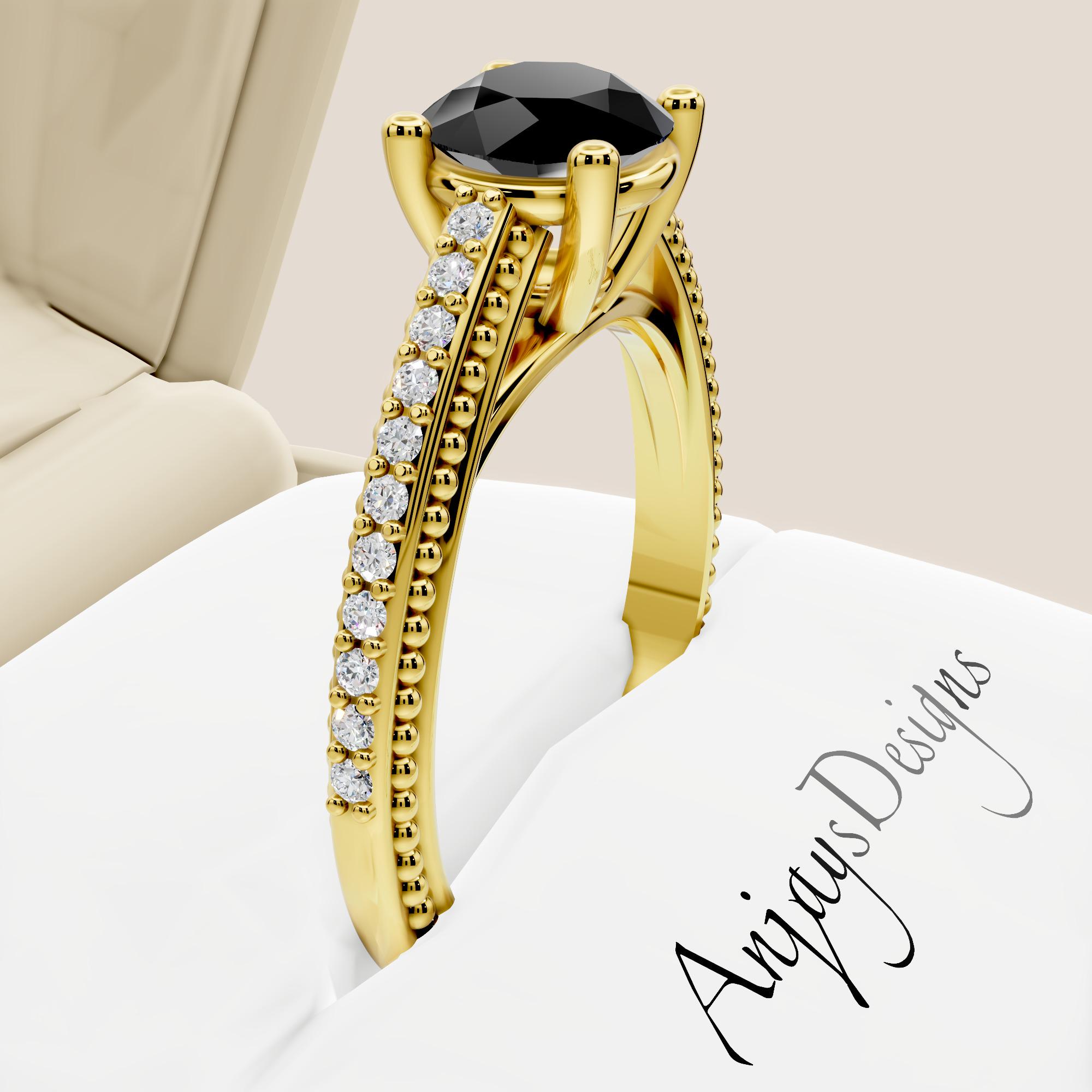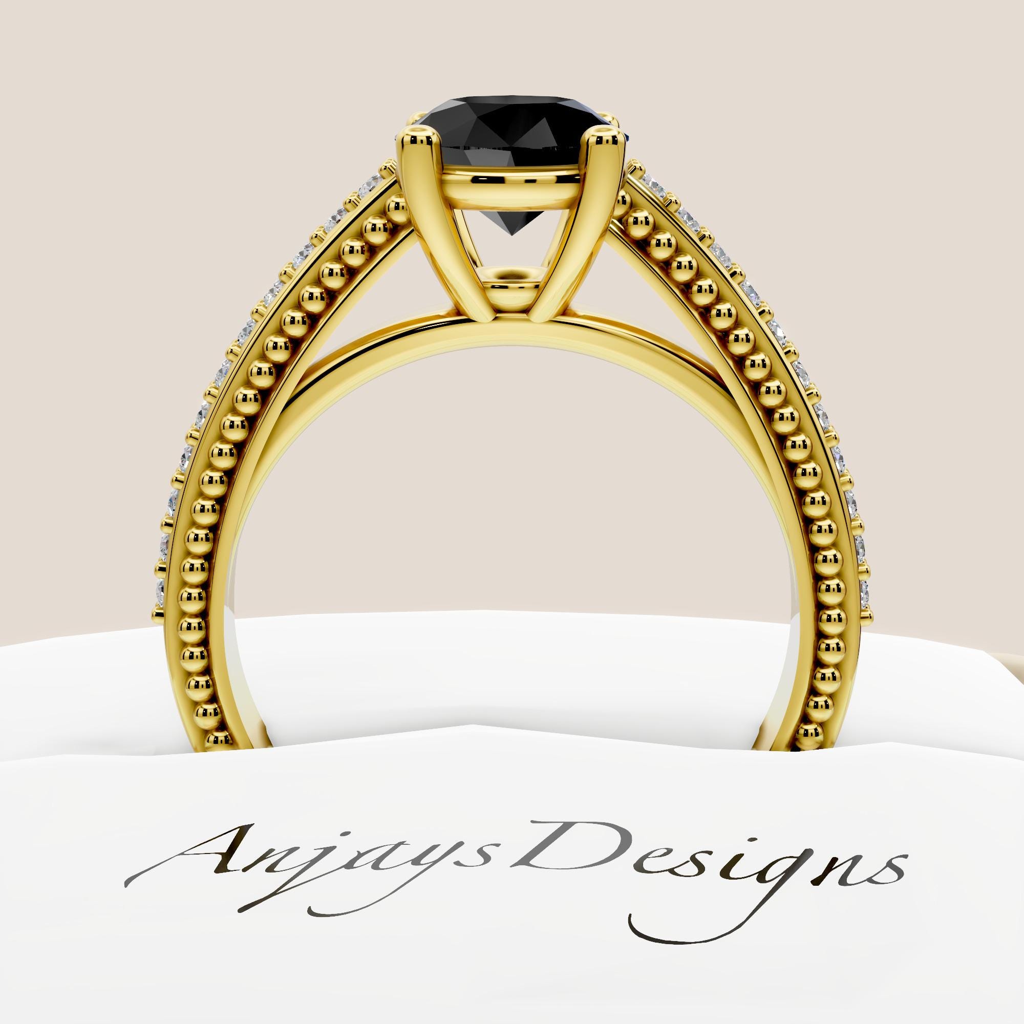 This 1 carat black diamond engagement ring is crafted in solid 14k yellow gold and features a classic 4 prong setting with intricate milgrain detailing! The minimalist design highlights the bold beauty of the center stone while adding a subtle vintage inspired touch along the edges. The round cut black diamond offers a deep, captivating sparkle, making it a unique and modern alternative to traditional engagement rings!